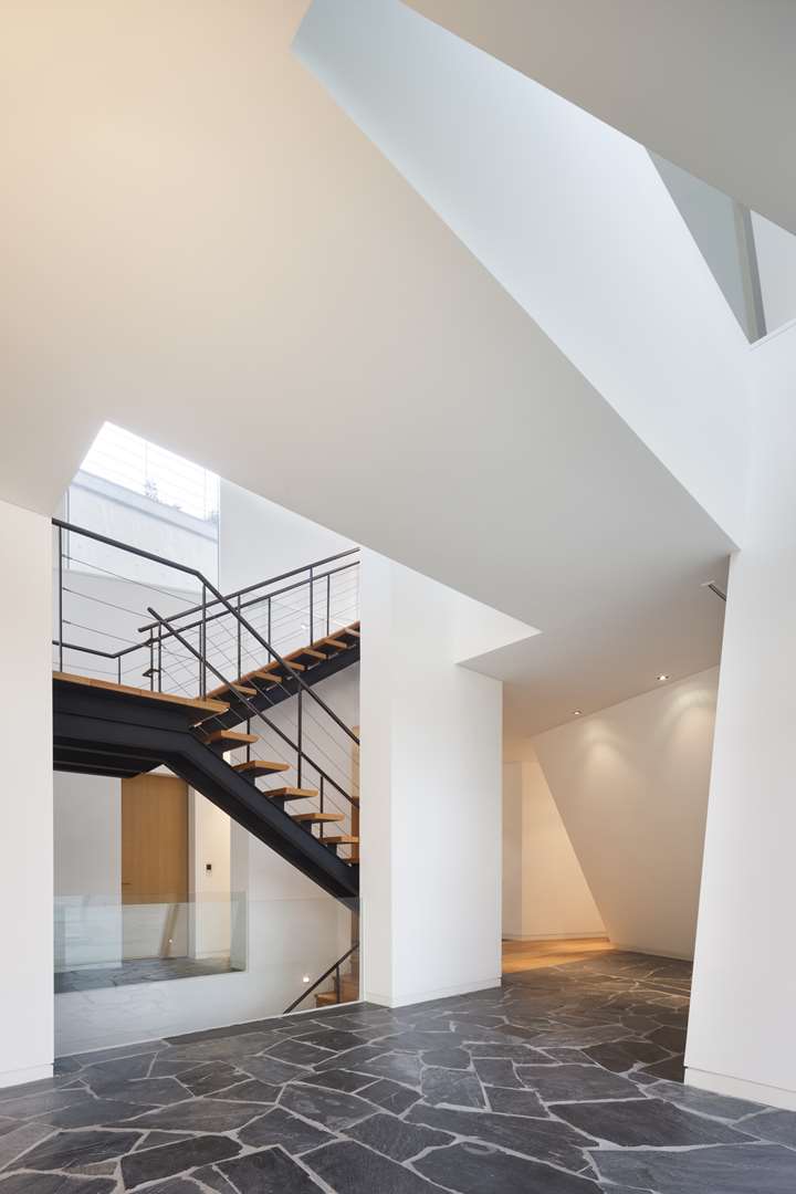 This project provided a very rare chance to plan a structure at the edge of a cliff. Since it is built against the wall of a cliff, it takes a radical, pinwheel-like form derived from centrifugal geometry rather than conventional rectilinear form defined by horizontal and vertical axis. Originating from the center, its four arms or vectors expand in four directions. The vertical vectors stretch upwards and downwards, which is then flanked by horizontal vectors extending out on each side. The vertical vectors contain the public functions such as living, dining rooms and party room while the horizontal vector contain the more private functions including bedrooms and bathrooms. By such spatial organization, each program can enjoy a sense of independency and privacy.