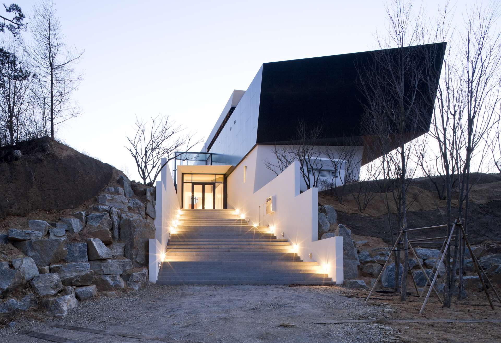 The weekend retreat is located on a gently sloping hillside at Hongcheon province which is well known for its beautiful mountain and river scenery.